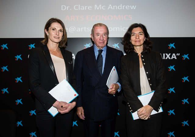 El presidente de la Fundación Arte y Mecenazgo, Leopoldo Rodés; su directora, Mercedes Basso (derecha), y la autora del informe, Clare McAndrew.