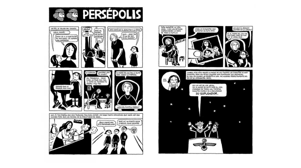En Persépolis, la autora opta por narrar su historia con un blanco y negro naíf y expresionista, acorde con una época y un país sin matices, donde la protagonista es una niña irreverente, que tiene que convivir con el horror de la barbarie religiosa. Satrapi narra los hechos más traumáticos de su infancia y adolescencia, como la detención y asesinato de su tío Anouch, pero no se muestra complaciente consigo misma, siendo capaz de mirarse en el espejo más oscuro al narrar cuando se vio obligada a vender droga en Viena, su depresión o sus coqueteos con el nacionalismo en el transcurso de la guerra entre Irán e Irak. Persépolis es un honesto y comprometido relato autobiográfico, que atrapa a quien se adentra en sus páginas.
