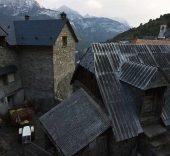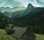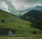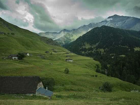 La sencillez de estas construcciones contrasta con la grandiosidad del paisaje que las rodea, poderosas paredes verticales salpicadas de espesos bosques y tapizadas por verdes prados de alta montaña.