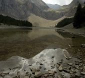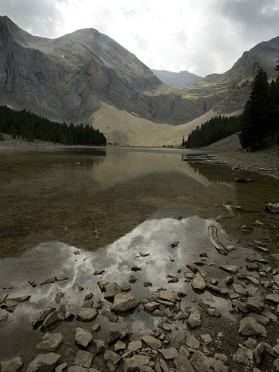 Sobre las escarpadas cumbres que rodean al lago glaciar pasan lentamente las nubes, proyectando su sombra hipnótica y refrescante, la suave brisa acaricia nuestra piel y oímos el silbido del viento al pasar por el bosque de pinos que crece en el circo. Aquí arriba se respira a gusto, se absorbe seguridad vital y ligereza de corazón. Este escondido lugar es considerado por muchos como uno de los rincones más bellos del Pirineo.