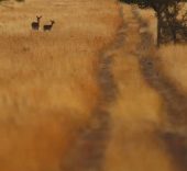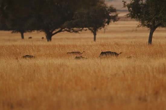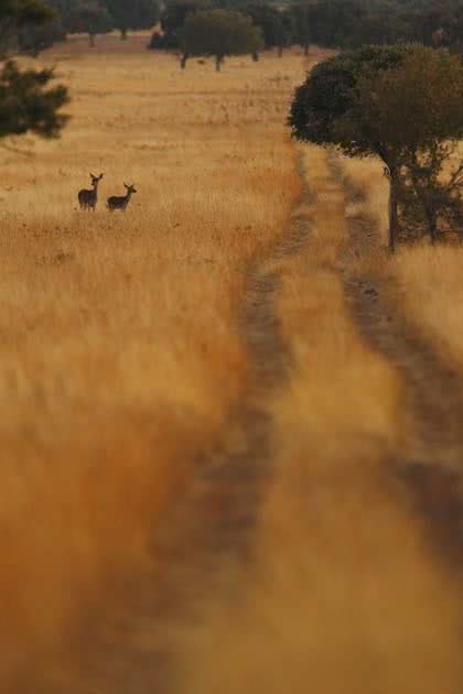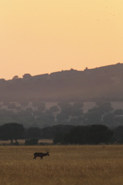 El atardecer en cabañeros nos sumerge en un universo de espacio y luz. A medida que el sol se hunde en el horizonte, los montes se tiñen de azul oscuro, el cielo se viste de rojo mientras la raña adquiere un brillo deslumbrante, adornado por la silueta gris de los ciervos.