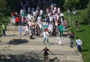 -Iratxe Jaio / Klaas van Gorkum. Los artistas trabajan con el documental en procesos de análisis de los comportamientos sociales que se insertan en los sistemas de producción (el urbanismo, el consumo, los medios de comunicación, etc.). Tiempo muerto presenta en tres proyecciones de vídeo el registro de una marcha zombie hacia un centro comercial de Barakaldo. La marcha, organizada por los artistas junto con la productora de arte Consonni como parte del proyecto Quédense dentro y cierren las puertas (www.zombies.parallelports.org) está basada en una escena de Dawn of the Dead (1978), la película de George A. Romero que presenta por vez primera la figura del zombie como alter ego del consumidor alienado. Junto a esas proyecciones, unas fotografías de los espacios vacíos por los que transcurrió la marcha, recientemente urbanizados, señalan las prácticas sociales como creadoras del espacio social.