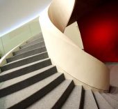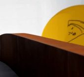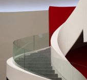Desde el lateral, llama la atención el blanco inmaculado del conjunto, que contrasta con el gris de esta ciudad eminentemente industrial. Tras el cambio de perspectiva, la fachada del Auditorio, con sus 26 metros –el edificio más alto del Centro–, nos sorprende por su amarillo intenso y el dibujo a grandes y delicados trazos de una mujer que descansa plácidamente y que parece darnos la bienvenida.