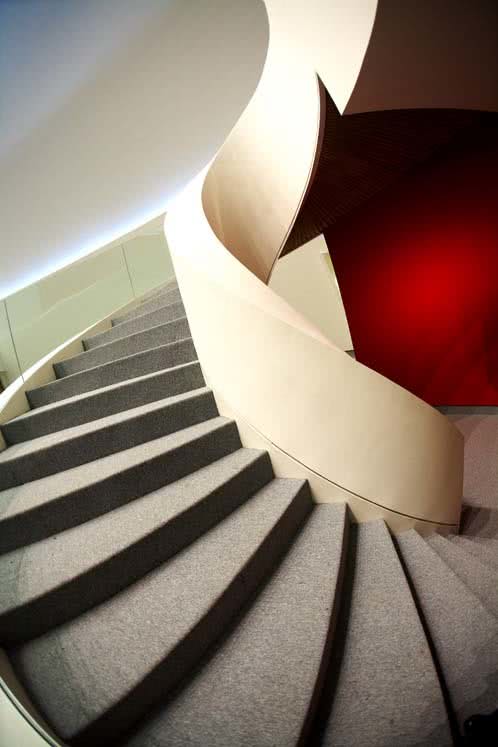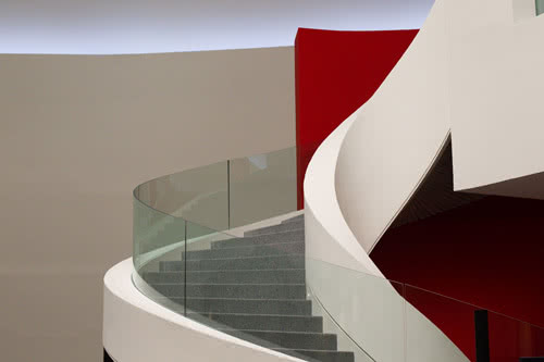 Desde el lateral, llama la atención el blanco inmaculado del conjunto, que contrasta con el gris de esta ciudad eminentemente industrial. Tras el cambio de perspectiva, la fachada del Auditorio, con sus 26 metros –el edificio más alto del Centro–, nos sorprende por su amarillo intenso y el dibujo a grandes y delicados trazos de una mujer que descansa plácidamente y que parece darnos la bienvenida.