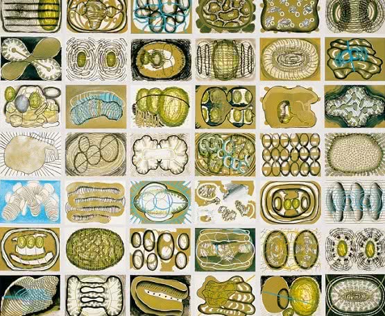 Sus conocidos polípticos y dípticos comparten espacio con una representación de sus piezas, con fotografías igualmente centradas en la serie como proceso de trabajo, donde la sensación de continuidad y linealidad de los colores, trazos y formas es una constante. No hay un final, al menos de forma intencionada.