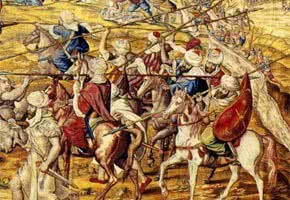 El hilo conductor de la selección de tapices para esta exposición es el tema de la guerra o la batalla, con joyas como La batalla de Zama, de la serie Historia de Escipión. Pero las obras más importantes de esta exposición son dos tapices de la magnífica serie La conquista de Túnez que Jan Cornelisz Vermeyen dibujó en 1548 por encargo de Carlos V. Estos tapices ofrecen al espectador un panorama vertiginoso de la toma de Túnez, una de las innombrables campañas del César Carlos.