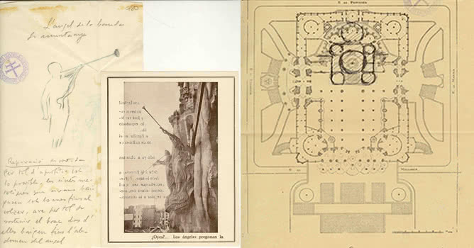 De la maqueta polifunicular se muestra un saquito de peso y las placas metálicas de marcaje, también sus compases de picapedrero, una factura de la construcción de la iglesia firmada por Gaudí, el atril del altar y los candelabros que Jujol, su aprendiz –de quien Gaudí decía que sabía encontrarle el color que imaginaba–, hizo para la iglesia.