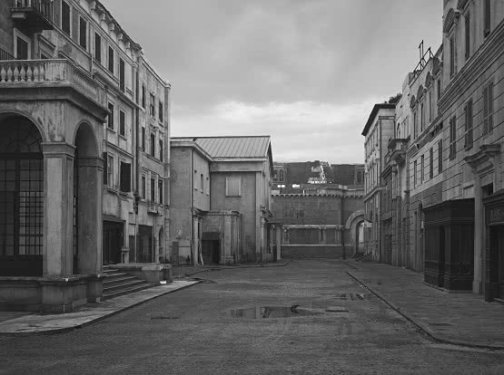 En otras, los edificios de época son enmarcados por calles adoquinadas y, allí donde se abre la tierra ahora alcanzada por hierbas e hierbajos; las estatuas en ruinas, los grafftis raros en una pared, los charcos de agua de lluvia, y algún detrito más lejos acentúan la ausencia misteriosa de vida que estas imágenes transportan, aumentada por la luz ambiental del alba y del crepúsculo. La escala íntima de las fotografías en blanco y negro sirve para intensificar aún más el patetismo de cada escena desierta.