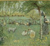 La tercera oposición se establece entre el jardín decorativo, escenario del ocio, y el jardín productivo, es decir, los huertos. Las dos últimas salas de la exposición en el Thyssen se concentran en la dedicación de Camille Pissarro al tema del huerto, con especial énfasis en la figura del trabajador (en consonancia con las convicciones anarquistas del artista). Toda una serie de artistas que recibieron las lecciones de Pissarro o experimentaron su influencia están representados también aquí: Cézanne, Guillaumin, Gauguin, Van Gogh, Ensor y Bonnard.
