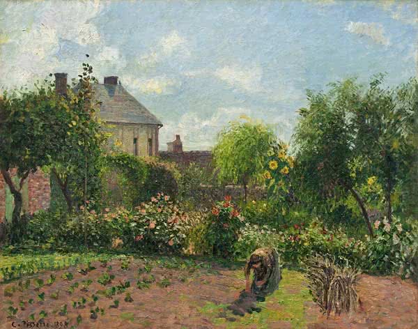 La tercera oposición se establece entre el jardín decorativo, escenario del ocio, y el jardín productivo, es decir, los huertos. Las dos últimas salas de la exposición en el Thyssen se concentran en la dedicación de Camille Pissarro al tema del huerto, con especial énfasis en la figura del trabajador (en consonancia con las convicciones anarquistas del artista). Toda una serie de artistas que recibieron las lecciones de Pissarro o experimentaron su influencia están representados también aquí: Cézanne, Guillaumin, Gauguin, Van Gogh, Ensor y Bonnard.