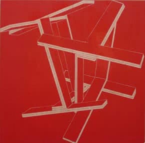En esta última exposición, tres elementos –balda, banco y biga– articulan el espacio expositivo de manera silenciosa: la balda, como soporte de las esculturas de pequeño formato, en el espacio de la entrada, alimentando el dialogo de las mismas con las pinturas enfrentadas a ellas; el banco vacío, acompañando a la escultura central que domina totalmente la sala grande de la galería y que se refleja en la pintura blanca de 310 x 366 cm. del muro frontal; y, por último, la biga, que conforma la pieza de la sala inferior. A ellos se suma el espejo como elemento distorsionador que actúa redefiniendo el espacio.