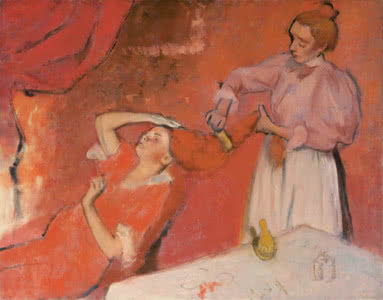 Picasso heredó y transformó otro de los temas favoritos de Degas –las mujeres bañándose y peinándose–, al que volvió en repetidas ocasiones a lo largo de un período de más de cincuenta años. La exposición revela que ambos artistas exploraban este íntimo mundo femenino en todos los medios y formatos, que van del más diminuto al más monumental. El escultural cuadro de Picasso Mujer peinándose (1906, Museum of Modern Art, Nueva York) se presenta al lado de dos óleos de Degas: el radiante El Peinado (c. 1896, National Gallery, Londres), de tonos rojos y rosados, y la inmensa y aparentemente inacabada Mujer desnuda secándose (1884-1886, Brooklyn Museum, Nueva York).