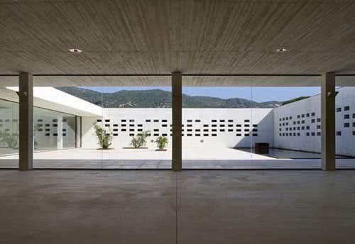 El edificio premiado es una construcción semienterrada, con lo que se evita el impacto visual sobre el conjunto arqueológico y su entorno protegido, de 7.300 metros cuadrados de superficie construida, muros de hormigón blanco visto, encofrado de tabla de madera, cubiertas de acero cortén y patios de piedra caliza.