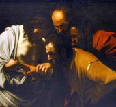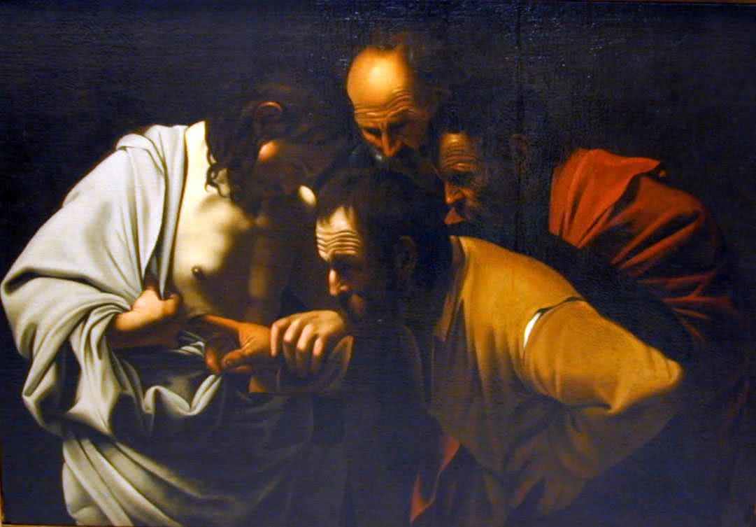 Para ilustrar el Barroco italiano se ha seleccionado un impresionante óleo sobre lienzo de Caravaggio, La incredulidad de Santo Tomás, un fantástico exponente de su estilo caracterizado por su composición unitaria, los contrastes brutales de luz y sombra, y la atmósfera real que impresiona hondamente al espectador.