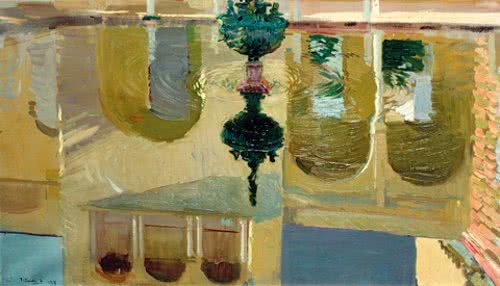 En estas composiciones, donde la presencia humana está desterrada, las arquitecturas vegetales, los mármoles, las cerámicas, las fuentes, la luz y los colores cobran vida. El pincel del artista se detiene sobre los reflejos del agua, la luz que disuelve las geometrías arquitectónicas y sobre el mosaico cromático de los jardines.